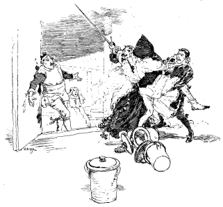 Being master of these arts, I got to Seville at my fellow-travellers’ expense, winning all the hire of the mules, my other charges, and money to boot, of them and my landlords at the inns. I alighted at that they call The Moor, where I was found out by one of my schoolfellows at Alcalá, whose name was Mata, but he, thinking it did not make noise enough, had changed it to Matorral. He dealt in men’s lives, and sold cuts and slashes, a trade which throve well with him; he carried the sign of it on his face, where he had received his share. He always made his bargain to a nicety for length and depth, when he was to bestow any, and said, “No man is so absolute a master, as he who has been well hacked and hewn himself.” And he was in the right, for his face was one seam, and himself all slashes. He told me, I must go sup with him and his comrades, and they would bring me back to the inn. I went with him, and when we were in his lodging, he said, “Come, spark, lay by your cloak and look like a man, for this night you shall see all the brave fellows in Seville; and that they may not look upon you as a cully, tumble your band, thrust out your back, and let your cloak hang loose, as if it were dropping off, for we hate to see any man’s cloak set fast upon his back. Screw your chops about, and make faces with both sides of your mouth, then talk big, using the rough words of us gentry.” I learned his lesson, and he lent me a dagger, broad enough to have been a scimitar, and for length it wanted nothing of a sword but the name. Now drink off this quart of wine,” said he, “for without you vapour you will not look like a true bully.” We had gone so far in my instructions, and I was half seas over with what I had drank, when in came four of the gang, with faces like old gout-shoes, bound about the middle like monkeys with their cloaks instead of ropes, their hats standing a tiptoe on their heads, and cocked up, as if the brims were nailed to the crowns; a whole armourer’s shop about them in swords and daggers, and the points of them beating against their right heels; their eyes staring, their whiskers turned up, and their beards like brushes. They made their compliment with their mouths, and then, in a hoarse tone, and clipping their words, saluted my companion in a gibberish, who answered in like manner. They sat down, and spoke not one word to ask who I was, but one of them looking at Matorral, and opening his mouth, thrust out his under lip, by way of pointing at me. My introducer answered in the same language, laying hold of his beard, and looking down; after which they all got up, embraced, and expressed a great deal of kindness for me. I returned the same compliments, which were like smelling to so many hogsheads of wine. When it was supper time, in came a parcel of strapping scoundrels to wait at table, whom the topping bullies call under-spur-leathers. We all sat down together at table, and the first thing they served up was a dish of pickles, which as soon as they had tasted, they all fell to drinking to my honour, by way of welcome; and till I saw them drink to it, I must confess I never knew I had any. Next came fish and flesh, all of it high seasoned to promote drinking. There was a great bowl full of wine, like a half tub, on the ground, and he that was to pledge, lay all along to drink by wholesale. I was taken with the contrivance, but by the time a few healths had gone about we none of us knew one another. They fell to talk of warlike affairs, and oaths flew as thick as hail. A matter of twenty or thirty persons were cut out for destruction. The Mayor of the city was adjudged to be cut in pieces; then they talked of the glorious memory of Domingo Tirynado and Gayon, and poured out wine in quantity for the soul of Escamilla.[22] Some that were maudlin wept bitterly, calling to mind the untimely end of Alonzo Alvarez, one of their brethren, whose body was exposed on a gibbet for the crows to feast on. By this time my companion’s brains were turned topsy-turvy, and laying hold of a loaf, and looking earnestly on the candle, he said with a hoarse voice, “By this, which is the face of God, and by that light which came out of the angel’s mouth, if you think fit, gentlemen, we will this very night maul the sergeant’s man that pursued our poor one-eyed friend.” They all set up a dismal cry, ratifying the proposal made by an oath after this manner: They drew their daggers, laid their hands on the edge of the bowl, and lying along with their chops to it, said, “As we drink this wine, so will we suck the blood of every informing catchpole.” “Who was this Alonzo Alvarez,” said I, whose death is so much regretted?” “He was,” answered one of them, “a brave fighting lad, a man of spirit, full of mettle, and a good companion. Let us go, for the devil begins to be strong in me.” This said, we all went out a catchpole-hunting. Being quite overcome with wine, and all my reason drowned, I never reflected on the danger I was running myself into. We came to the Strand, where we met the round, which no sooner appeared, but our swords were drawn and we attacked them. I did like the rest, and at the first charge we made way for the filthy souls of two catchpoles to fly out of their bodies. The constable took to his heels, and ran up the street, crying out for help. We could not pursue, because he had too much the start, but took sanctuary in the cathedral, where we were sheltered against justice, and slept as much as was requisite to discharge the fumes of the wine we had drank. When we came to our senses, I could not but wonder that two catchpoles should be killed by, and a constable fly from, a parcel of mere hogsheads of wine, for we were no better at that time. We fared well in our sanctuary, for the gay nymphs of the town flocked to us, and spent all they had upon us. A strapping jade, called La Grajales, took a fancy to me, and clothed me from head to foo
