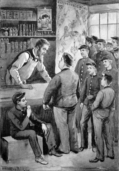 Finally they dragged him to a corner of the drill-hall, where a large box stood on end, and hoisting him to the top of it with much roughness, they bent before him in mock reverence, hailing him as “His Fatness[22] the King of Hogland.” He beamed down upon them good-naturedly for a moment, and then replied, in his peculiar, falsetto voice,—
