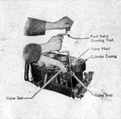 Place the mixture sparingly on the bevel face of the valve. Put the valve in position on the valve seat, and rotate it back and forth (about a quarter turn) a few times, with a Ford grinding tool. Then lift slightly from the seat, change the position and continue the rotation, and keep on repeating this operation until the bearing surface is smooth and bright. The valve should not be turned through a complete revolution, as this is apt to cause scratches running around the entire circumference of the valve and seat. When the grinding is completed the valve should be removed from the cylinder, thoroughly washed with kerosene, and the valve seat wiped out thoroughly. Extreme care should be taken that no abrasive substance gets into the cylinders or valve guides. This can be avoided if the grinding paste is applied sparingly to the bevel face of the valve. If the valve seat is worn badly or seamed, it is best to have it reseated with a valve seating tool. This operation requires considerable skill, and perhaps had better be done by an expert mechanic. Care should be exercised against making too deep a cut, necessitating the retiming of the valve.