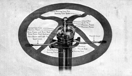 Under the steering wheel are two small levers. The right-hand (throttle) lever controls the amount of mixture (gasoline and air) which goes into the engine. When the engine is in operation, the farther this lever is moved downward toward the driver (referred to as "opening the throttle") the faster the engine runs and the greater the power furnished. The left-hand lever controls the spark, which [4]explodes the gas in the cylinders of the engine. The advancing of this lever [5] "advances the spark," and it should be moved down notch by notch until the motor seems to reach its maximum speed. If the lever is advanced beyond this point a dull knock will be noticed in the engine. (See chapter on Ignition.)
