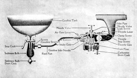 The ten-gallon gasoline tank should be filled—nearly full—and the supply should never be allowed to get low. When filling the tank be sure that there are no naked flames within several feet, as the vapor is extremely volatile and travels rapidly. Always be careful about lighting matches near where gasoline has been spilled, as the air within a radius of several feet is permeated with the highly explosive vapor. The small vent hole in the gasoline tank cap should not be allowed to get plugged up, as this would prevent proper flow of the gasoline to the carburetor. The gasoline tank may be drained by opening the pet cock in the sediment bulb at the bottom.