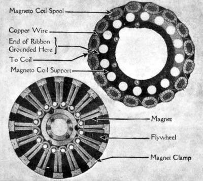 On the downward stroke the suction of the piston draws the fresh gas from the carburetor, through the inlet pipe and valve, into the cylinder. The upward movement of the piston compresses the gas into a very small space, between the top of the piston and the depression in the cylinder head, known as the "combustion chamber." (The compressed gases exert a pressure of approximately 60 pounds per square inch.) At this point the electric spark, generated by the magneto, explodes the gases—driving the piston downward—thus producing the power which turns the crank shaft. On the next stroke upward the piston drives the exploded gas out through the exhaust valve and pipe to the muffler. (See Cut No. 3.)