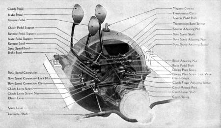 The first one toward the left operates the clutch. When pressed forward the clutch pedal engages the low speed. When half-way forward the clutch is in neutral (i. e., disconnected from the driving mechanism of the rear wheels), and the releasing of this pedal engages the high-speed clutch. The center pedal operates the reverse. The right-hand pedal operates the transmission brake.