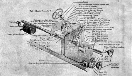 If the car is equipped with a starter the spark and throttle levers should be placed in the same position on the quadrant as when cranking by hand, and the ignition switch turned on. Current from either battery or magneto may be used for ignition. However, we recommend that the magneto be used at all times. The magneto was designed to furnish ignition for the Model T engine and better results will be obtained by operating in this way. Special attention must be paid to the position of the spark lever as a too advanced spark will cause serious backfiring which in turn will bend or break the shaft in the starter. The starting motor is operated by a push button, conveniently located in the floor of the car at the driver's feet. With the spark and throttle levers in the proper position, and the ignition switch turned on, press on the push button with the foot. This closes the circuit between the battery and starting motor, causing the pinion of the Bendix drive shaft to engage with the teeth on the flywheel, thus turning over the crankshaft. When the engine is cold it may be necessary to prime it by pulling out the carburetor priming rod, which is located on the instrument board. In order to avoid flooding the engine with an over rich mixture of gas, the priming rod should only be held out for a few seconds at a time.