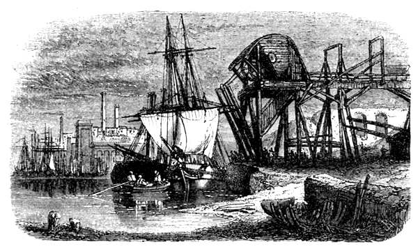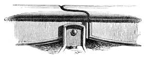 While such are the expedients adopted to insure safety, others equally ingenious are adopted to insure speed. In the case of express and mail trains, the frequent stopping of the engines to take in a fresh supply of water occasions a considerable loss of time on a long journey, each stoppage for this purpose occupying from ten to fifteen minutes. To avoid such stoppages larger tenders have been provided, capable of carrying as much as 2000 gallons of water each. But as a considerable time is occupied in filling these, a plan has been contrived by Mr. Ramsbottom, the locomotive engineer of the London and Northwestern Railway, by which the engines are made to feed themselves while running at full speed! The plan is as follows: An open trough, about 440 feet long, is laid longitudinally between the rails. Into this trough, which is filled with water, a dip-pipe, or scoop attached to the bottom of the tender of the running train, is lowered, and, at a speed of 50 miles an hour, as much as 1070 gallons of water are scooped up in the course of a few minutes. The first of such troughs was laid down between Chester and Holyhead, to enable the Express Mail to run the distance of 84-3/4 miles in two hours and five minutes without stopping; and similar troughs have[xv] since been laid down at Bushey, near London; at Castlethorpe, near Wolverton; and at Parkside, near Liverpool. At these four troughs about 130,000 gallons of water are scooped up daily.