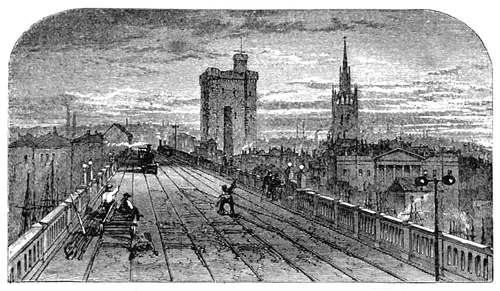 Since the partial opening of the Greenwich Railway in 1836, a large extent of railways has been constructed in and about the metropolis, and convenient stations have been established almost in the heart of the city. Sixteen of these stations are within a circle of half a mile radius from the Mansion House, and above three hundred stations are in actual use or in course of construction within about five miles of Charing Cross. The most important lines recently opened for the accommodation of the London local traffic have been the London, Chatham and Dover Metropolitan Extensions (1861), the Metropolitan (1863), the North London Extension to Liverpool Street (1865), the Charing Cross and Cannon-street Extensions of the Southeastern Railway (1864-6), and the South London Extension of the Brighton[xvii] Railway (1866). Of these railways, the London, Chatham and Dover carried 5,228,418 passengers in 1867; the Metropolitan, 23,405,282; the North London, 17,535,502; the Southeastern, 17,473,934; and the Brighton, 12,686,417. The total number carried into and out of London, as well as from station to station in London, in the same year, was 104 millions of passengers.
