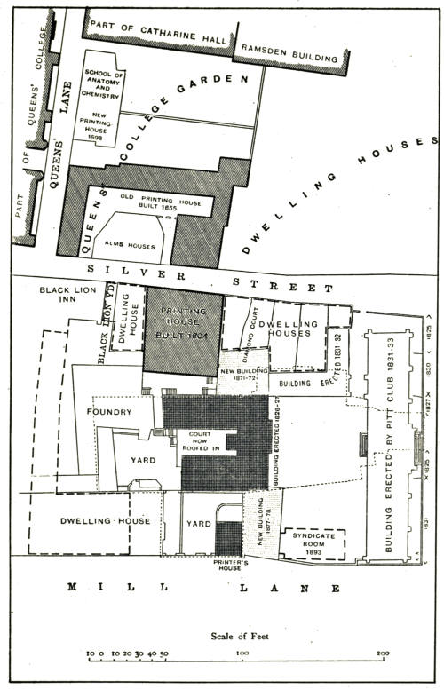 In addition, my personal obligations are many: Mr Francis Jenkinson, University Librarian, Mr Charles Sayle, Mr A. T. Bartholomew, and many other members of the Library staff have helped me ungrudgingly, both in putting their own special knowledge at my command and in guiding me to the[vi] proper authorities; the Registrary (Dr J. N. Keynes) and his staff have similarly given me ready access to the documents in their charge; Mr J. B. Peace, University Printer, provided me with the picture which serves as frontispiece and with the revised plan of the Press buildings; Mr G. J. Gray corrected several of my statements in proof and gave me the benefit of his own latest researches into the career of John Siberch before they were published; to many other friends (including my colleagues in the several departments of the Press) I am indebted for items of advice and help too many to be enumerated.