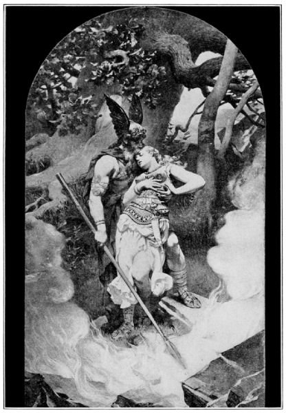 When the gods had formed the earth—which they called Midgard—they chose the most beautiful spot they could find for their home. In the very centre of the earth rose a lofty mountain, and on the top of it was a broad, lovely meadow where the gods built their shining city of Asgard. In the midst of the city was a spacious hall, made of gold and the purest marble, and here were the thrones where the gods sat when in council.[4] Beyond the hall were the palaces of the gods[5A] and goddesses,[5B] also made of marble and silver or gold, and near by was a huge smithy where the gods forged the weapons needed to defend their city from their enemies the frost-giants.