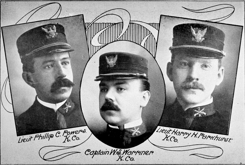 Every officer of the three companies and fully 70 per cent. of the men who had been in their ranks in the militia service was on hand. Capt. John J. Leonard of G, a veteran in the militia, was at the head of his company and with him his two lieutenants, T. A. Sweeney and E. J. Leyden. Capt. Henry McDonald of B company, a veteran both of the regular army and the militia, and his lieutenants, William L. Young and Harry J. Vesper were on hand promptly and so was Capt. W. S. Warriner and Lieutenants P. C. Powers and Harry H. Parkhurst of K company. All three companies were proud of their officers and they had every reason to be.