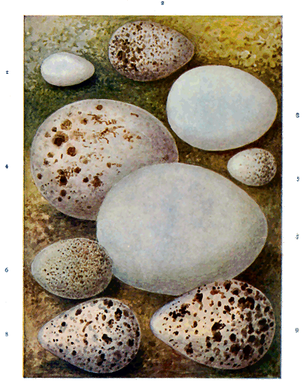 Mechanical Construction of Eggs.—We now come to another phase of the protective principle, even more remarkable than those we have already discussed, and equally useful. This is in the mechanical construction of eggs to suit their situation and surrounding conditions. What an admirable provision Nature has shown in placing the axis of a bird's egg just where it will prevent it rolling off a flat surface, such as a ledge of rock, when moved by the terrible gusts of wind that sweep over high latitudes, or perhaps roughly moved by the parent bird suddenly fluttering off when scared.