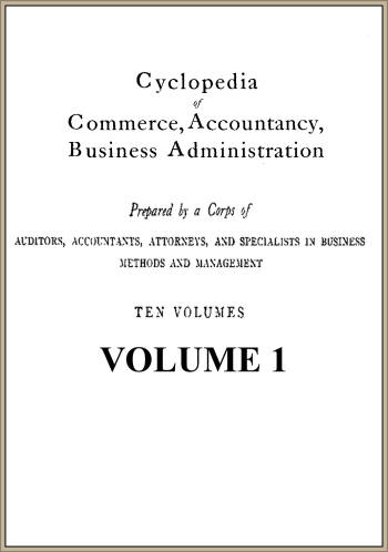The Project Gutenberg EBook of Cyclopedia of Commerce, Accountancy, Business Administration, v. 1, by Various This eBook is for the use of anyone anywhere at no cost and with almost no restrictions whatsoever. You may copy it, give it away or re-use it under the terms of the Project Gutenberg License included with this eBook or online at www.gutenberg.org Title: Cyclopedia of Commerce, Accountancy, Business Administration, v. 1 Author: Various Release Date: July 26, 2014 [EBook #46424] Language: English Character set encoding: UTF-8 *** START OF THIS PROJECT GUTENBERG EBOOK CYCLOPEDIA OF COMMERCE *** Produced by Giovanni Fini, Juliet Sutherland and the Online Distributed Proofreading Team at http://www.pgdp.net