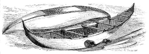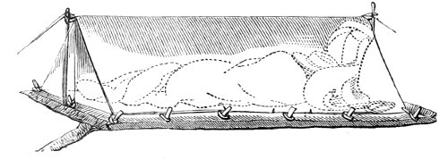 Take a blue cloth pilot coat, cut long enough to reach just below the knees; have it lined throughout with woollen material; let the pockets be made extra strong, and order the buttons to be large, of black horn, and sewn on with double-waxed thread. The left hand breast pocket should be deep and lined with leather, as it not unfrequently becomes a resting-place for the revolver when you do not wish to make an ostentatious display of it. Get a couple of real Scotch caps, such as the Highland shepherds wear; nothing can equal them for sleeping in when camping out, and they form a most convenient head-covering for camp use, or when the sun is not too powerful. Get from some sailors’ outfitter a regular seagoing sou’wester hat, with ear and neck flaps, and a pair of oiled canvas overalls to match. Procure also from some first-class maker a thoroughly good india-rubber coat; long enough to come well below the tops of the butcher boots. Buttons should be sewn in at the back and sides of the collar, in order to admit of a hood of the same material being put on when needed. An arrangement of this kind we have found most useful for boat work and in heavy tropical rains. Order also a piece of the best Russia duck, 9ft. by 8ft.; have this subjected to the waterproofing process; have the edges turned in to form a 2in. hem; and at every two feet, at both sides and ends, have good sized wide flanged brass eyelets punched in. Then in the centre of the piece have a longitudinal slit made 16in. in length, have the raw edge bound with a broad strong tape, and at every 3in. on each side have an eyelet of less size than those at the edges put in. This arrangement admits of the slit being laced close when it is not required. A waterproof square of this kind is useful for an almost endless number of purposes. In the first place it can be used as a ground sheet to sleep on; it can, by thrusting the head through the unlaced opening, be converted into an excellent cloak; it can by fastening strings and pegs to the sides, and cutting a ridge pole, be converted into a very fair substitute for a small tent; it forms an excellent carpet to lay by the side of the tent bed, when you are fortunate enough to be able to use one, keeping down insects, and protecting the feet from sharp grass, stumps, and twigs. If during rain the tent should admit water, as it sometimes will (especially if heedlessly touched when saturated with moisture), this universal square of duck can by the aid of some upright sticks or canes, one at the head and another at the foot of the bed, and a bit of rope stretched like a clothes line from one to the other, be at once made use of as a roof to the bed, the sides being made to slope and stand out by attaching pieces of twine to a few of the side poles. Clothes and other matters can be securely carried when rolled up in this, even in the heaviest rain. On a pinch, even a river might be crossed with its assistance, but the method adopted for constructing extempore rafts, boats, canoes, and floats, will be fully treated on when that subject comes under consideration.