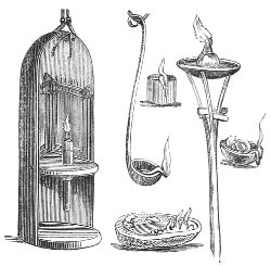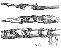 It will be well also to procure from a saddler a good supply of bootlaces. These should be cut straight and in the way of the grain of the hide. The white leather used by carters for mending their harness is by far the best for the purpose. Strips of this cut to about the eighth of an inch square, and well greased with mutton suet, are next to indestructible, and are available for all sorts of purposes apart from that of lacing boots or shoes. Slightly burning or roasting the ends in the candle or fire hardens them sufficiently to pass freely through the lace holes without a tag.