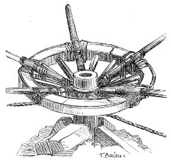 “In our remarks on the new Breech-loading Revolver manufactured by Mr. ——, we noticed as important defects, first, the fact that occasionally a missfire occurs; and secondly, that the drag on the base of the discharged copper cases is sometimes a serious obstacle to the revolution of the chambers. Since that time we have had submitted to us for trial by Mr. Crane, of 3, Royal Exchange, London, a Revolver taking a central-fire cartridge, which completely does away with these objections. There is no great novelty in the plan adopted, it being made up of the best parts of various well-known pistols; but, as a whole, it, in our opinion, approaches very closely to absolute perfection. The bore is the same as —— largest size, ·442, while the weight is a quarter of a pound less—Crane’s new Revolver weighing 2lb. 4oz. against 2lb. 8oz. as in ——. The ignition is exactly on the same principle as the central-fire shot cases now in general use, the missfires from which are certainly not more than one in a thousand, and probably not so high. In addition to this advantage, in consequence of the blow of the hammer being given on the centre of the base, after the explosion takes place the empty case is driven forward from the face of the false breech, and not the slightest grind or drag occurs in the revolution. We have shot 50 rounds without a missfire; but of course, this test would not be sufficient of itself. As, however, the caps, anvil, &c., are exactly similar to those which have been successfully tested in the field during the last two seasons, we need not discuss that question. Mr. Crane has succeeded in regulating the action so nicely that, even when using the self-cocking process, we have been able to make very fair practice with his pistol. We give an engraving with a section of the ball, which we understand is likely to be adopted in the service. It is manufactured by the Messrs. Eley, and we believe will be sold at about the same price as the rim-fire cartridge, viz., 7s. or 8s. per 100. Altogether we can strongly recommend this Revolver, especially as it is to be sold, as soon as it can be supplied in sufficient numbers, at £4 10s., in oak case complete.”