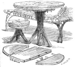 In dealing with this portion of our subject we can but generalise, as the destination of the traveller and the objects he has in view will materially modify the nature and extent of his equipment. The military officer who is bound on a long march, through a comparatively wild country, needs a very different outfit from that which a hunter or trader of experience would procure for himself before starting for the home of the elephant and the savage. The man who, with his wife and family, seeks a new home beyond the border line which divides the unreclaimed wilderness from civilised society, needs an infinitely more voluminous store of requisites—not to say comforts—than the small band of hardy explorers or hunter naturalists, who, with horse, mule, pack and rifle, wend their way over prairies and mountains without path, and thread the forests and thickets where no traveller has penetrated. There are other members of the human family who prefer prosecuting their wanderings alone, carry all their worldly possessions with them, and whose equipment is usually of a particularly simple and practical character. The sea, the inland lake, and the rivers flowing through little known regions, each have their explorers, for whose use a variety of contrivances are needed. Some of these are best made at home; others it will be found most convenient to prepare in the localities in which their aid are required; whilst at times adverse circumstances will render it necessary to improvise rough and ready appliances to save life and prolong its duration when saved. We shall therefore endeavour to give such hints and directions as will enable our readers who intend visiting far-off countries to select such matters as may be best purchased before quitting England, and to avoid encumbering themselves with useless impedimenta. As we have first made mention of the military officer about to depart on service, we will suppose that he is in London, or any other large town, gathering together his traps for a start. We will then accompany him on his shopping expeditions, and give him a few hints as to what will prove most useful. On matters of uniform we can have nothing to say further than to advise, as we do in every case of purchase, that it be obtained from some tradesman of well-established reputation. The raiment calculated to meet the requirements of refined society, when the uniform is for the time cast aside, must also be left to the dictates of the prevailing mode and the good taste of the wearer.