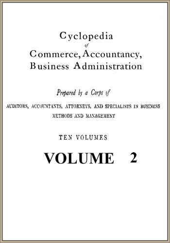 The Project Gutenberg EBook of Cyclopedia of Commerce, Accountancy, Business Administration v. 2, by Various This eBook is for the use of anyone anywhere at no cost and with almost no restrictions whatsoever. You may copy it, give it away or re-use it under the terms of the Project Gutenberg License included with this eBook or online at www.gutenberg.org Title: Cyclopedia of Commerce, Accountancy, Business Administration v. 2 Author: Various Release Date: July 30, 2014 [EBook #46448] Language: English Character set encoding: UTF-8 *** START OF THIS PROJECT GUTENBERG EBOOK CYCLOPEDIA OF COMMERCE *** Produced by Giovanni Fini, Juliet Sutherland and the Online Distributed Proofreading Team at http://www.pgdp.net