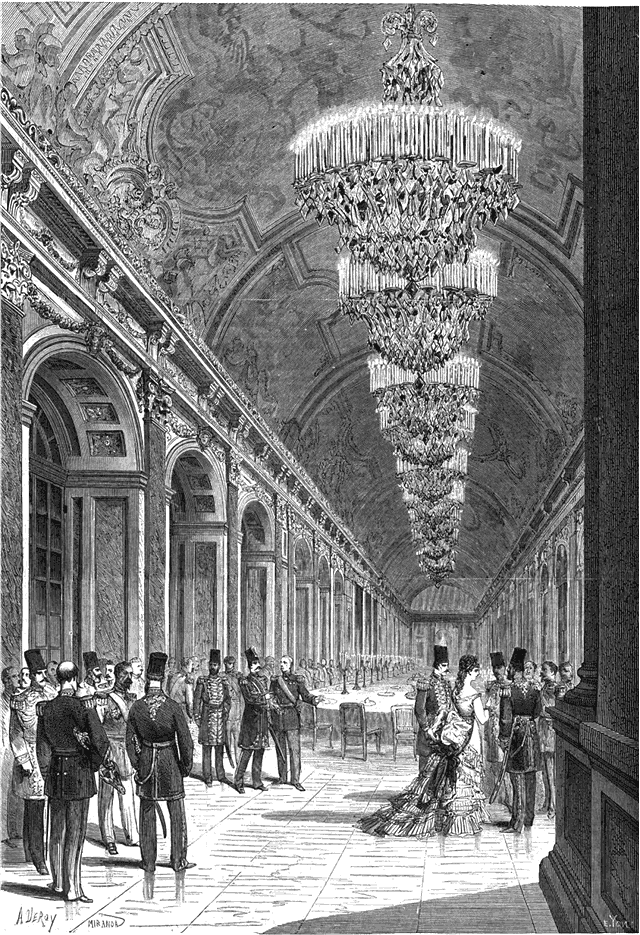 C'est en voiture que Nassr-ed-Din s'est rendu à Versailles, le mardi, surlendemain de son arrivée. Il a successivement rendu visite au président de l'Assemblée et au président de la République, avec lequel, toujours en voiture, il s'est ensuite promené dans le parc, pendant que jouaient les grandes eaux. A sept heures a eu lieu le dîner de gala, dîner d'hommes. Notre deuxième dessin représente l'aspect de la galerie des Glaces au moment de l'entrée des convives, au nombre de cent cinquante, tous appartenant au monde officiel. La salle des Glaces ne contenait pas moins de quinze lustres garnis de deux mille cinq cents bougies, dont l'effet était éblouissant.