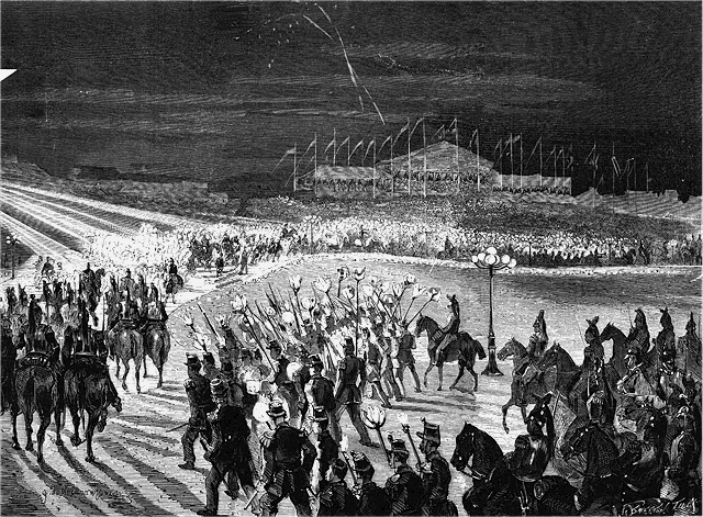 Le shah a surtout goûté le ballet de la Tour enchantée, dans la Juive, et a exprimé plusieurs fois le plaisir que lui causaient les pirouettes et les jetés-battus des premiers sujets. À onze heures, la fête était terminée et tout y avait marché à la satisfaction générale. Celle du lendemain eut une fin moins heureuse, à cause du vent qui soufflait avec violence dès le matin. Elle devait consister, comme on sait, en une illumination des principaux monuments de Paris, auxquels la bourrasque n'a pas permis de rester un instant éclairés; en un feu d'artifice tiré sur la Seine et en une retraite monstre aux flambeaux. Le centre de la fête était le Trocadéro, sur l'esplanade duquel, au sommet du grand escalier, on avait construit un immense pavillon couvert, avec grand salon, salle de repos, buffet, etc., le tout orné de tentures de soie, de glaces et de fleurs. De chaque côté de ce pavillon s'élevaient des tribunes destinées au corps diplomatique, aux députés et aux principaux fonctionnaires. Le reste de l'esplanade était garni de gradins et de chaises pour le public. Le shah est arrivé à la tribune réservée à neuf heures et demie, avec une suite des plus nombreuses. Aussitôt des feux de Bengale rouges, verts et blancs, ont éclairé de leurs lueurs éclatantes les flots de population qui se pressaient le long des pelouses. Puis des soleils ont été allumés sur la Seine et des bombes aux mille couleurs ont éclaté dans l'air. Au même instant on entendait les premières notes de la retraite qui se formait en colonne sur le quai de Billy, et se disposait à monter par une des allées de côté sur la place du Trocadéro. Des pelotons de fantassins, armés de torches ou de lances surmontées de lanternes, séparaient les tambours et les musiques, et si le vent n'avait pas éteint un grand nombre de ces torches, le tableau eut été d'un très-grand effet. La foule était immense dans le Champ-de-Mars; elle était moins grande sur le Trocadéro, la pluie et le vent ayant chassé beaucoup de curieux et surtout de curieuses en toilette. Mais tout le monde se foulait aux Champs-Elysées et sur la place de la Concorde, dont l'éclatante illumination a duré jusqu'à minuit. Le shah est rentré à onze heures et demie par l'avenue d'Antin. Au moment où il arrivait au palais de la rue de l'Université, la façade du Corps législatif s'est soudainement éclairée de feux de Bengale verts et rouges, qui ont été les derniers de la journée.