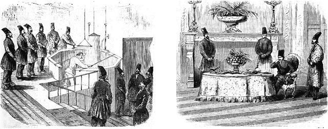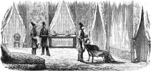 Quand je dis comme un simple mortel, ce n'est pas tout à fait exact. Aucun des actes de la vie intime d'un roi, et surtout d'un roi de Perse, ne peut s'accomplir aussi simplement que cela. Il suffira, pour s'édifier à ce sujet, de jeter un coup d'œil sur la huitième page des dessins que renferme ce numéro. Il y a dans cette page quatre croquis, dont l'un représenté précisément le shah dans sa chambre à coucher. Chambre magnifiquement décorée, comme on peut penser. Mais la chose importante, c'est le lit. Il est élevé sur une estrade de deux marches recouvertes de velours grenat, et présente la forme de deux cornes d'abondance se réunissant par la base. Deux candélabres énormes sont placés à la tête et au pied, et un dais, composé de tentures de velours grenat également, et brodées d'or, le couronne. Un petit escabeau placé sur la seconde marche de l'estrade permet au shah d'enjamber le lit. C'est là qu'il repose, mais non pas comme vous et moi, fermant les yeux et autant que possible ne faisant qu'un somme, après avoir soufflé sa bougie. Le sommeil du shah est intermittent. De temps à autre son grand-vizir, ou quelque autre dignitaire descend du premier étage pour lui communiquer une nouvelle; ou bien encore il se réveille pour manger une orange que s'empresse de lui présenter quelqu'un des familiers qui passent la nuit dans sa chambre. Deux d'entre eux doivent constamment l'éventer avec la main lorsqu'il repose, et grimpent sur le lit pour accomplir leur mission qu'ils n'interrompent que pendant que le shah reçoit une communication ou suce une orange. Il en mange ainsi cinq ou six chaque nuit. Il y en a toujours dans sa chambre une pleine corbeille posée sur une table d'ébène incrustée d'or, où se trouvent également une assiette de macarons, un verre d'eau, ses lunettes et quelques journaux que son médecin, le docteur Tholozan, lui lit tous les matins en venant prendre de ses nouvelles. Après quoi le shah procède à sa toilette, ou plutôt on procède à la toilette du shah. L'opération a lieu dans un boudoir entièrement tendu de satin bleu broché, et meublé d'une toilette avec deux cuvettes à l'anglaise, d'un grand divan et d'un fauteuil, canne et bois noir, très-léger, profond, avec dossier plein. Notre dessin représente le shah qu'est en train de raser son barbier, accompagné de deux aides. Il est vêtu d'une espèce de stambouline, tunique à petits plis, de couleur grise et bordée de fourrures. Il y a aussi le bain. Celui dont use le shah est l'ancien bain du duc de Morny, en marbre blanc, avec tapis de cordes. La baignoire, établie au milieu de la pièce, dont la seconde moitié est surélevée, a la forme d'une tourelle, ou plutôt d'une grande margelle de puits, que traversent deux cordes destinées à servir de points d'appui. Au-dessus il y a aussi un petit trapèze dont l'usage ne demande pas d'explications. Le shah prend son bain à une température très-élevée. Il y entre, tête nue, habillé de mousseline blanche, causant avec une douzaine de ses familiers qui sont là pour le distraire, mais qui, n'était le respect, riraient souvent jaune, j'imagine, vu la température élevée du lieu. Cependant l'appétit est venu et l'heure du déjeuner approche. Nassr-ed-Din est servi dans son salon particulier et mange seul. Les mets sont préparés à la française par un chef français; toutefois ce sont des cuisiniers persans qui préparent les mets spéciaux, riz en pilaco, en bouillie et au gras, petits poissons au safran, etc. Le shah mange les mets français avec une fourchette, et les mets nationaux avec ses doigts, les doigts de la main droite, que pour cette raison il plonge à chaque instant dans un aiguière placée à côté de lui et qu'il présente ensuite à un domestique chargé de la lui essuyer. Il aime beaucoup les fruits: les oranges, les pêches, surtout les cerises, et cela se comprend. Ce qui se comprend moins, c'est sa façon de manger ces dernières: trempées dans le sel. Le café et le thé sont servis par le cafedgi, sorte d'échanson ayant rang à la cour. Ce fonctionnaire porte une robe en cachemire à fond violet, à palmes rouge et or. Deux domestiques sont attachés à sa personne. Quant à lui, il ne sert que le roi. Mais, assez regardé par dessus le mur de la vie privée du shah! Otons l'échelle.