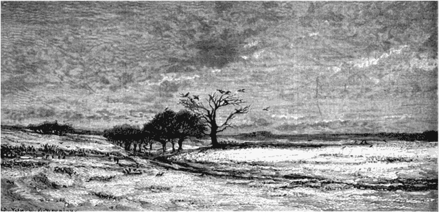Et pourtant, quelle intensité d'effet! Comme l'œil erre, sans savoir où se fixer, sur ces lointains blanchâtres, qui se confondent avec le gris sombre des nuages! Ce n'est pas tel ou tel champ de tel ou tel pays, c'est l'hiver dans tout ce qu'il a de froid et de triste, c'est décembre, à l'aspect morne et désolé, rendu avec une rare vigueur et une extraordinaire puissance d'expression.