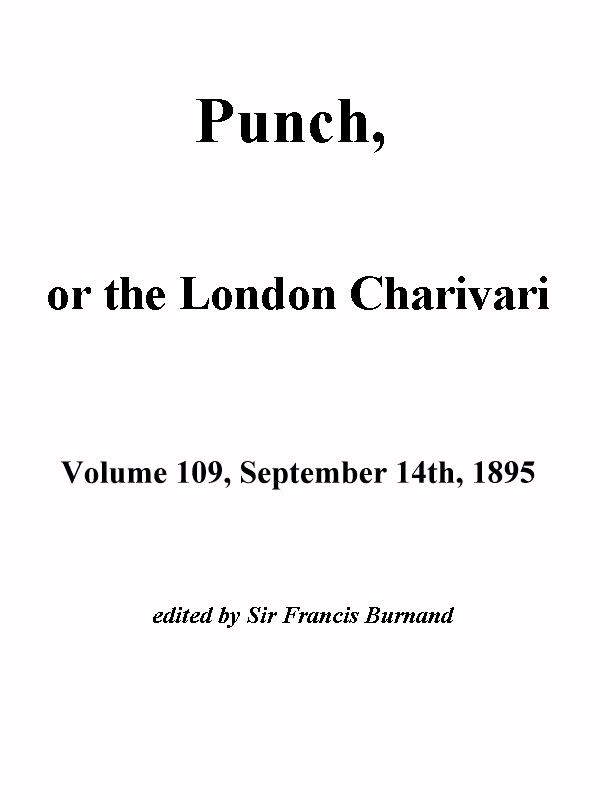 The Project Gutenberg EBook of Punch, or the London Charivari, Vol. 109, September 14th, 1895, by Various This eBook is for the use of anyone anywhere at no cost and with almost no restrictions whatsoever. You may copy it, give it away or re-use it under the terms of the Project Gutenberg License included with this eBook or online at www.gutenberg.org Title: Punch, or the London Charivari, Vol. 109, September 14th, 1895 Author: Various Editor: Francis Burnand Release Date: August 14, 2014 [EBook #46583] Language: English Character set encoding: ISO-8859-1 *** START OF THIS PROJECT GUTENBERG EBOOK PUNCH *** Produced by Punch, or the London Charivari, Malcolm Farmer, Lesley Halamek, and the Online Distributed Proofreading Team at http://www.pgdp.net