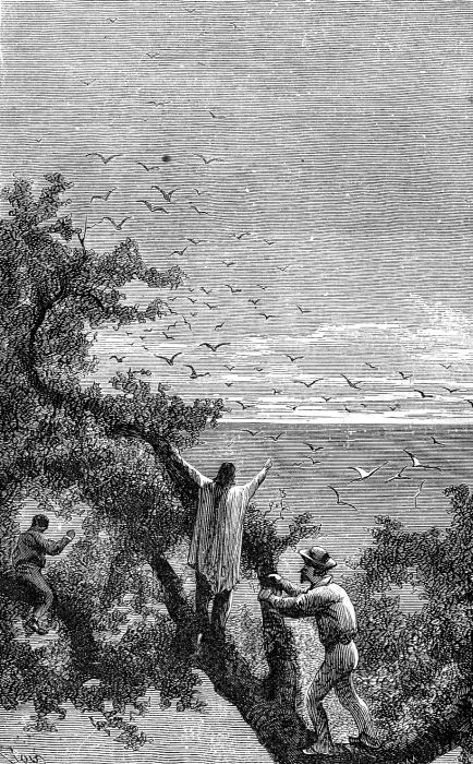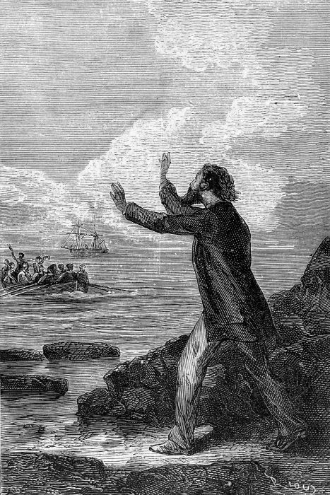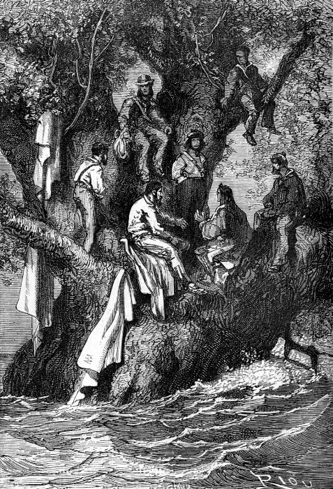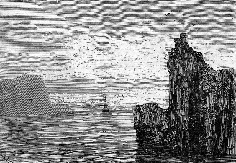 The passengers could see the quartermaster, with folded arms, standing motionless as a statue, on a rock, and gazing at the vessel.—p. 613.