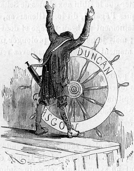 Lord Edward Glenarvan was on board with his young wife, Lady Helena, and one of his cousins, Major MacNabb. The Duncan, newly constructed, had just been[Pg 10] making a trial voyage several miles beyond the Frith of Clyde, and was now on her return to Glasgow. Already Arran Island was appearing on the horizon, when the look-out signaled an enormous fish that was sporting in the wake of the yacht. The captain, John Mangles, at once informed Lord Glenarvan of the fact, who mounted on deck with Major MacNabb, and asked the captain what he thought of the animal.