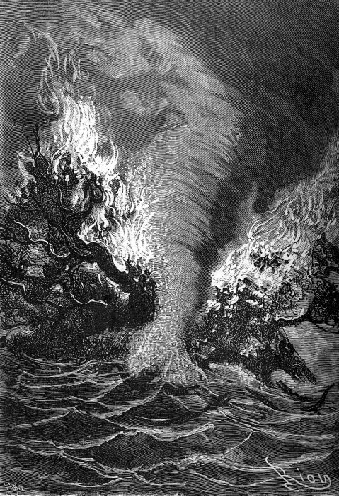 An incandescent column poured forth towards the sky with loud explosions, while streams of boiling water and lava rolled towards the encampment of the natives.—p. 553.