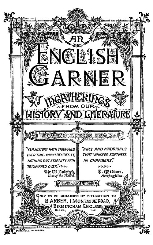 The Project Gutenberg EBook of An English Garner (4 of 8), by Various This eBook is for the use of anyone anywhere in the United States and most other parts of the world at no cost and with almost no restrictions whatsoever. You may copy it, give it away or re-use it under the terms of the Project Gutenberg License included with this eBook or online at www.gutenberg.org. If you are not located in the United States, you'll have to check the laws of the country where you are located before using this ebook. Title: An English Garner (4 of 8) Author: Various Editor: Edward Arber Release Date: August 21, 2014 [EBook #46645] Language: English Character set encoding: ASCII *** START OF THIS PROJECT GUTENBERG EBOOK AN ENGLISH GARNER (4 OF 8) *** Produced by Richard Tonsing, Jonathan Ingram and the Online Distributed Proofreading Team at http://www.pgdp.net (This file was produced from images generously made available by The Internet Archive/Canadian Libraries)