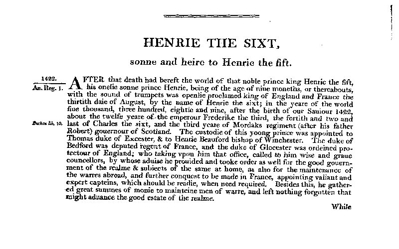 After that death had bereft the world of that noble prince king Henrie the fift, his onelie sonne prince Henrie, being of the age of nine moneths, or thereabouts, with the sound of trumpets was openlie proclamed king of England and France the thirtith daie of August, by the name of Henrie the sixt; in the yeare of the world fiue thousand, thrée hundred, eightie and nine, after the birth of our Sauiour 1422, about the twelfe yeare of the emperour Frederike the third, the fortith and two and last of Charles the sixt, and the third yeare of Mordaks regiment (after his father Robert) gouernour of Scotland. The custodie of this yoong prince was appointed to Thomas duke of Excester, & to Henrie Beauford bishop of Winchester. The duke of Bedford was deputed regent of France, and the duke of Glocester was ordeined protectour of England; who taking vpon him that office, called to him wise and graue councellors, by whose aduise he prouided and tooke order as well for the good gouernment of the realme & subiects of the same at home, as also for the maintenance of the warres abroad, and further conquest to be made in France, appointing valiant and expert capteins, which should be readie, when néed required. Besides this, he gathered great summes of monie to mainteine men of warre, and left nothing forgotten that might aduance the good estate of the realme.