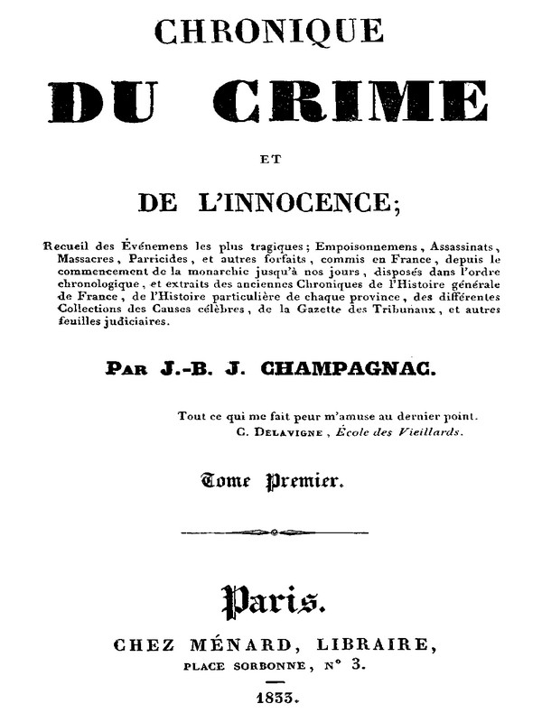 C'est dans le but de répondre à cette nécessité du moment, c'est dans l'espoir de plaire à la majorité des lecteurs, que nous publions la Chronique du Crime et de l'Innocence. Il nous a paru curieux, intéressant, et même instructif, de présenter, comme dans un vaste panorama, les actions les plus criminelles dont la France fut le théâtre.