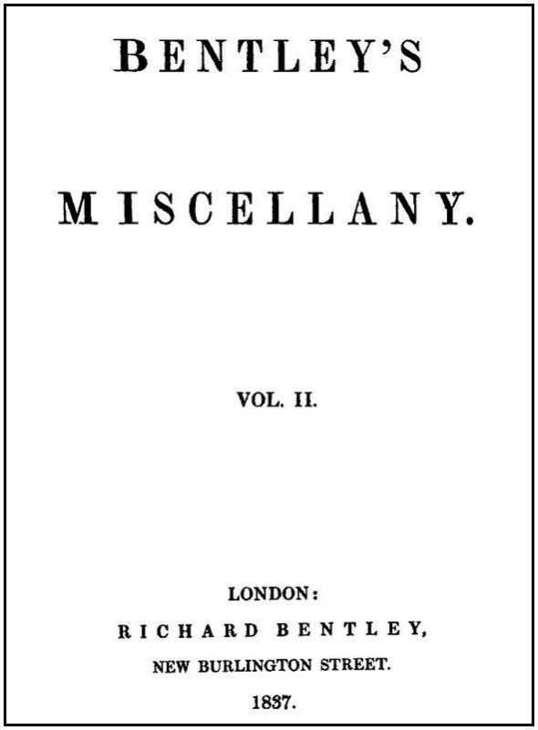 The Project Gutenberg EBook of Bentley's Miscellany, Volume II, by Various This eBook is for the use of anyone anywhere in the United States and most other parts of the world at no cost and with almost no restrictions whatsoever. You may copy it, give it away or re-use it under the terms of the Project Gutenberg License included with this eBook or online at www.gutenberg.org. If you are not located in the United States, you'll have to check the laws of the country where you are located before using this ebook. Title: Bentley's Miscellany, Volume II Author: Various Contributor: Richard Bentley Release Date: September 7, 2014 [EBook #46804] Language: English Character set encoding: UTF-8 *** START OF THIS PROJECT GUTENBERG EBOOK BENTLEY'S MISCELLANY, VOLUME II *** Produced by Jason Isbell, Chris Jordan and the Online Distributed Proofreading Team at http://www.pgdp.net (This book was produced from scanned images of public domain material from the Google Print project.)