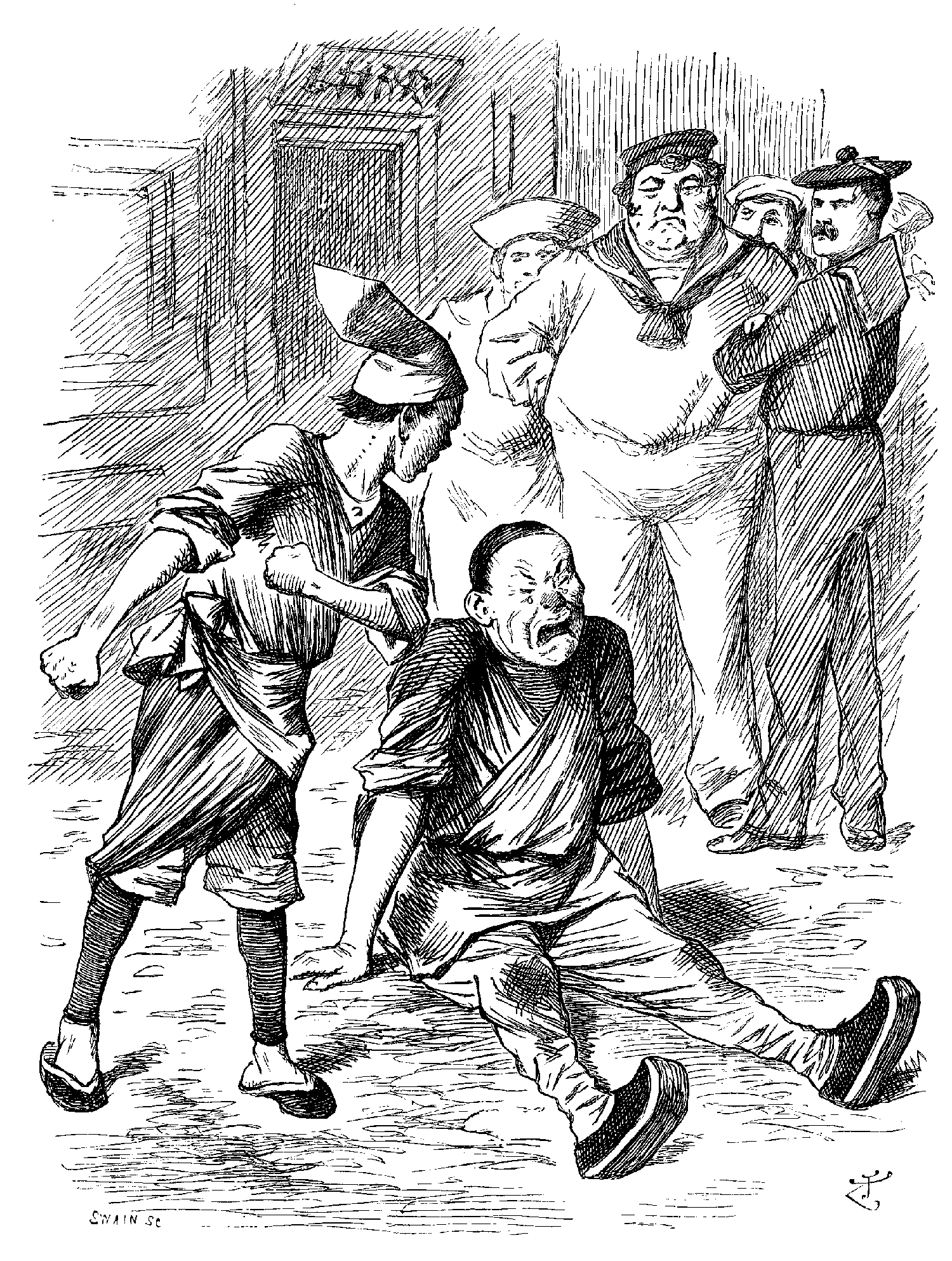 Johnny Chinaman. "BOO-HOO! HE HURTEE ME WELLY MUCH! NO PEACEY MAN COME STOPPY HIM!"