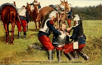 The cuirassiers are heavy cavalry for charging, not scouting. The French and German armies have each twelve regiments, and the Russians four. They are a survival of the 17th century, wearing steel cuirasses and helmets with horsehair plumes. Napoleon III's bodyguard, "Les Cents-Gardes," wore aluminum. They carry a long double-edged stabbing sword. St. Quentin was on the French route of retreat to Paris in the first stage of the war.
