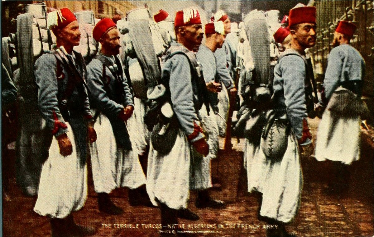 These are not negroes, but men of Berber origin with black beards and tanned faces. They are recruited in Algiers and are called "tirailleurs algieriens." Their headgear is the characteristic fez. The object resembling a football which they carry on the hip is a water bottle.