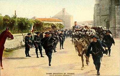 There are thirty battalions of "chausseurs alpins," who spend half each year in the French Alps. Each carries an alpenstock and a pack. They are among the hardiest and best trained French infantry, skilled with the rifle and in mountain warfare. Among the Vosges Mountains they tied themselves in trees, so when wounded they would not drop and betray their position.