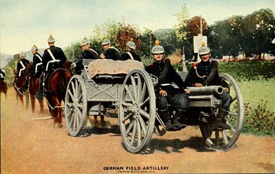 The French guns, by many military experts, are said to be superior to any other field artillery. Their bore is only 2.95 inches, but the initial velocity and accuracy are greater than the German guns, and their lightness makes them more mobile in action. A battery has about the same effect on an advancing line as a mowing-machine on a harvest field.