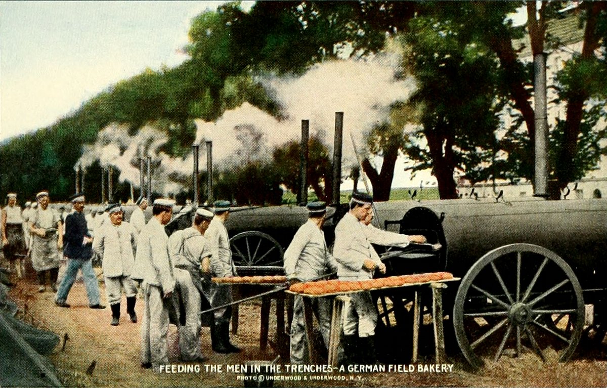 Napoleon said "An army travels on its stomach." This is part of the wonderful German organization for supplying the men in the field with daily bread. Each wagon supplies 1,600 men—there are twenty-five with each army corps of 40,000. The war ration includes bread, biscuit, eggs, meat, beans, rice, dried vegetables, salt and coffee.