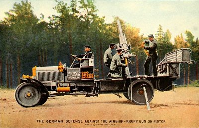 This is one of the deadly Krupp aeroplane guns, mounted on a Mercedes auto truck. The rear wheels are braced to steady the gun from vibration under the heavy shock of firing.