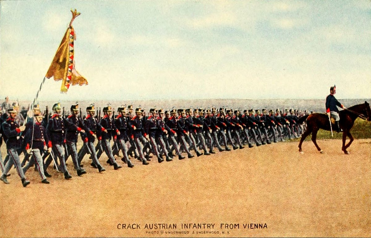 Austrian military traditions are equal to any in Europe. In the sixteenth century they turned back the tide of Turkish conquest and saved Europe. Military service is compulsory on all able-bodied males from 20 to 42, and totals twelve years—three in the line, seven in reserve, and two in the "Landwehr." The long trousers worn by these troops show that they are recruited from the Germanic part of the empire—for the Austrian army, like the empire itself, contains men speaking twenty-six different languages.