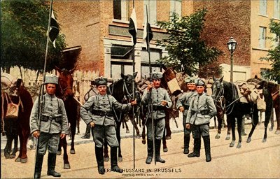Not all German cavalrymen are Uhlans. The Hussars also are light cavalry, adapted for reconnoitering. Both Uhlans and Hussars carry lances over ten feet long, made of a single steel tube drawn to a tempered point, with a pennon fluttering from it. In actual conflict these are usually removed. The color of the pennon shows from what state of the Empire the troopers come—the black-and-white ones in the picture show that they are Prussians.