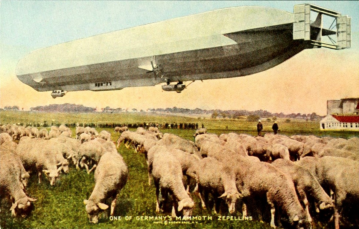 In the right background is seen the hangar, or shed, in which the craft is housed. The sheep have become accustomed to the hovering giant and feed quietly under it.