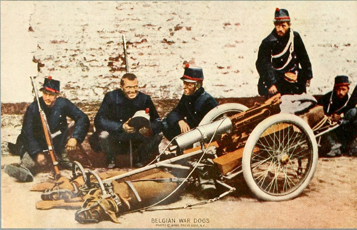 One of the most interesting sidelights of the war is the use of dogs to draw the Belgian "mitrailleuses." All who have visited Belgium have been surprised at the amount of work, such as hauling market wagons, performed by these animals. The rubber-tired gun carriage is in strange contrast with the bizarre appearance of the "dogs of war"—tired out after a stiff march.
