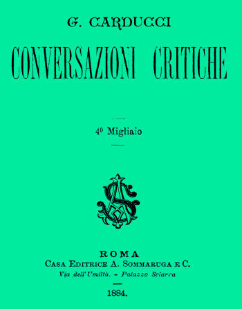 The Project Gutenberg EBook of Conversazioni critiche, by Giosuè Carducci This eBook is for the use of anyone anywhere in the United States and most other parts of the world at no cost and with almost no restrictions whatsoever. You may copy it, give it away or re-use it under the terms of the Project Gutenberg License included with this eBook or online at www.gutenberg.org. If you are not located in the United States, you'll have to check the laws of the country where you are located before using this ebook. Title: Conversazioni critiche Author: Giosuè Carducci Release Date: September 11, 2014 [EBook #46843] Language: Italian Character set encoding: ISO-8859-1 *** START OF THIS PROJECT GUTENBERG EBOOK CONVERSAZIONI CRITICHE *** Produced by Giovanni Fini, arlo Traverso and the Online Distributed Proofreading Team at http://www.pgdp.net (This file was produced from images generously made available by The Internet Archive/Canadian Libraries