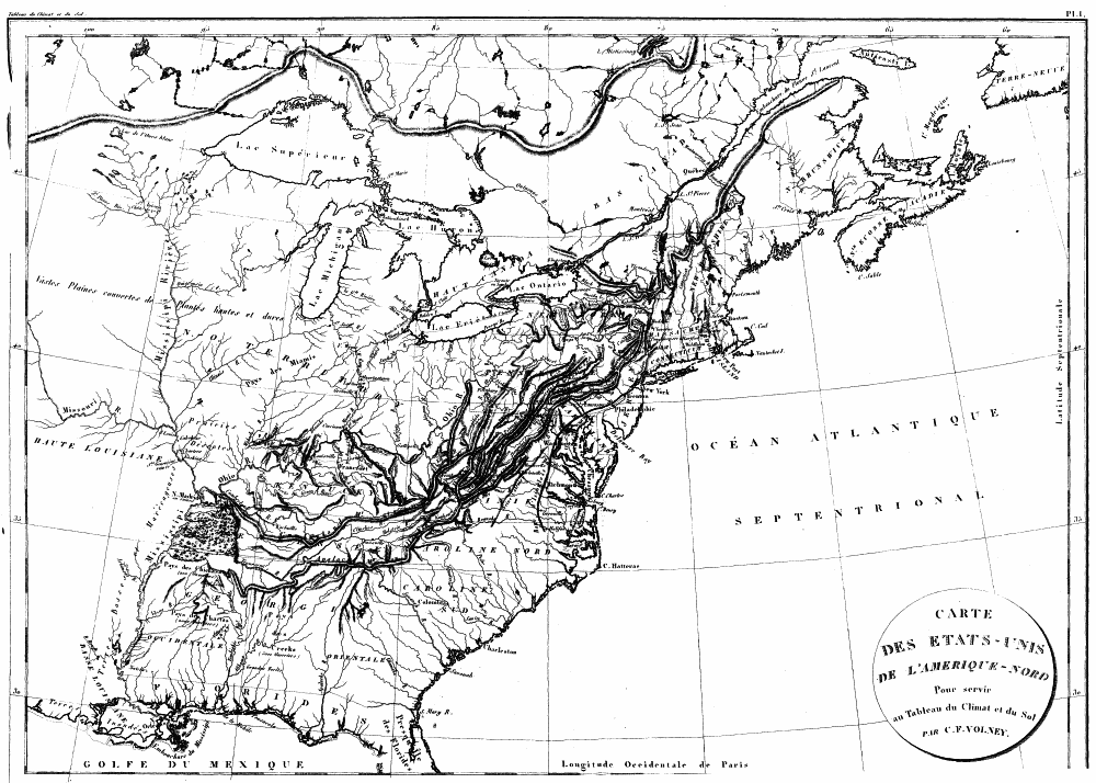 La quatrième enfin, est le climat des pays d’Ouest, tels que le Tennessee, le Kentucky, le Nord-d’Ohio, ou North-west-territory, placés derrière la chaîne des montagnes Alleghany, et au couchant des états précédents; ce climat a pour caractère distinctif d’être plus chaud de près de trois degrés de latitude que les pays qui lui correspondent{6} sur la côte Atlantique, avec la seule séparation des montagnes Alleghany, ainsi que je l’exposerai par la suite.
