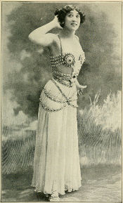 Before he gets half way down the village street of the first act, the commère, a statuesque fairy queen in silk tights, with real gems that are the talk of Paris, who has been hunting for him all over the town, suddenly comes upon him in the village square, and, touching him with her wand, makes him her protégé.