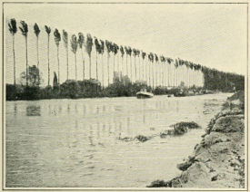 A little below all this I carry over a narrow bit of land to avoid the lock at Bougival. Here the Seine resembles somewhat the Thames. Fine estates with formal gardens run to the edge of the river. Cedar boats gay in colored cushions and silk parasols are drawn under shady trees, the nooks of idling house parties. From the walls of one country place the butler is fishing in his spare half hour before dinner. The gateway to this estate is protected by an iron grille bearing in gilt the crest of the family. A smart coupé passes, driven by a cockaded coachman.