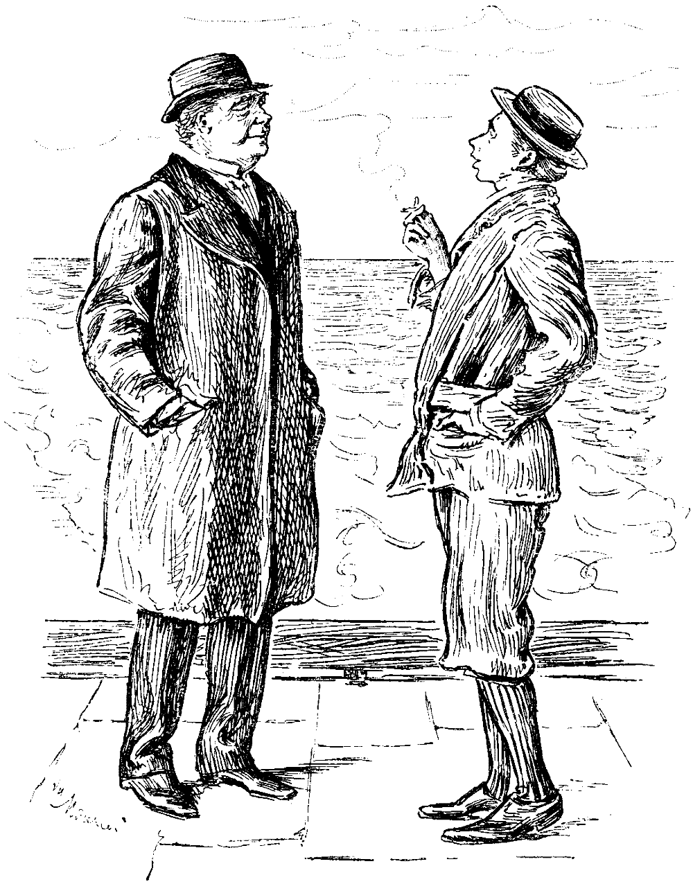 How to get to Ilfracombe.—Per rail, London and South-Western. Picturesque line of country. Another, and a longer route, per mare et terram, and therefore more varied and health-refreshing, which are important points to score if your holiday be circumscribed, is to take passage on board steamer, Pacific Orient Line for choice, which stops at Plymouth en route to give a last glance at Old England before proceeding across the Bay of Biscay to Naples, and, ultimately, Australia. Only drawback to this is the start from Fenchurch Street. Fenchurch Street Station enough to make anyone start. Wanted here a spacious, light and airy place where passengers carrying "hand properties" can move about rapidly without loss of that equanimity of temper which every traveller should cultivate under circumstances that would try even the joviality of that utterly impossible creation Mark Tapley. Still Mark Tapley is an ideal to be lived up to as near as may be; and the passenger who, with bag in hand, while struggling with mixed crowd in Fenchurch Street Station on the departure of any important Tilbury Dock train, can be jovial or even ordinarily polite, is already in a fair way towards earning the Ideal Tapley Medal.