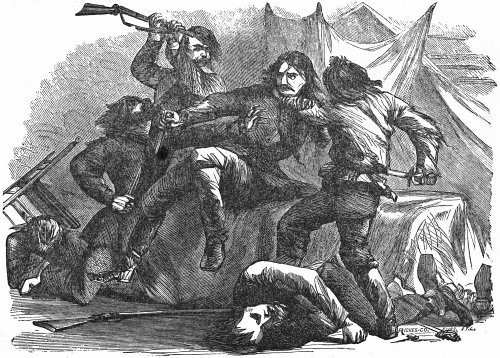 Fortune always favors the desperately brave, and27 we now have to record another extraordinary visitation of good luck to Bill. Price’s army had been fleeing more than a week before the victorious Curtis, whose troops outnumbered those of Price two to one. The pursuit had been continued until both armies were very much fatigued, and Price’s was so nearly exhausted that he was compelled to go into camp on a small creek twenty-five miles south of Little Rock. Wild Bill’s arms and legs were pinioned with thongs and he was confined in a one-room log-house with a single guard to prevent his escape. The house had but one door and one window, the latter being nearly two feet square and closed by a door made of clap-boards. Being bound hand and foot there was no avenue of escape, apparently, and Bill was forced to take a melancholy view of his situation. Night coming on, and the guard being nearly worn out, dozed off from time to time, feeling that his prisoner was perfectly secure. While meditating upon the execution announced to take place on the morrow, in which he was to be the chief character his eyes caught sight of the handle of an old case-knife which was sticking in an auger hole in one of the house logs. Changing his seat without arousing any suspicion from the guard, Bill managed to secure the rusty knife, and after long effort succeeded in cutting the cords which bound his wrists together. The dozing guard permitted him also to cut the cords on his feet, and the moment he was free Bill rushed on the guard like a tiger springing upon its prey and28 seizing him by the throat ripped open his abdomen in an instant. The guard fell dead from the knife thrusts without being able to give any alarm, and, seizing the musket and taking the guard’s coat, which he hastily put on, Bill fled out into the darkness and made good his escape.