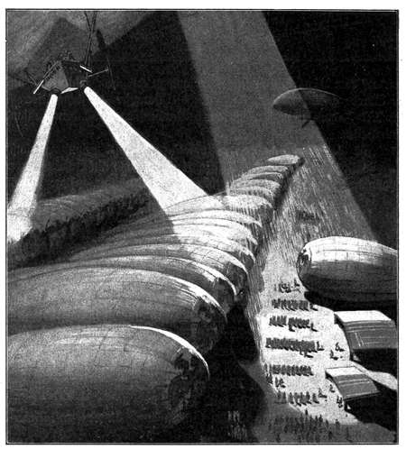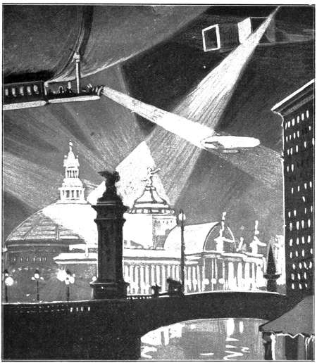 Und nachts, wenn Millionen von Lichtern den Himmel erhellen, und durch ihr vereintes Feuer weit in das Dunkel umher eindringen werden, dann wird die Stadt einer ungeheueren Fackel gleichen, um die schnell vorwärtsstrebende Flugmaschinen, riesigen Motten gleich, vorbeihuschen und verschwinden werden.